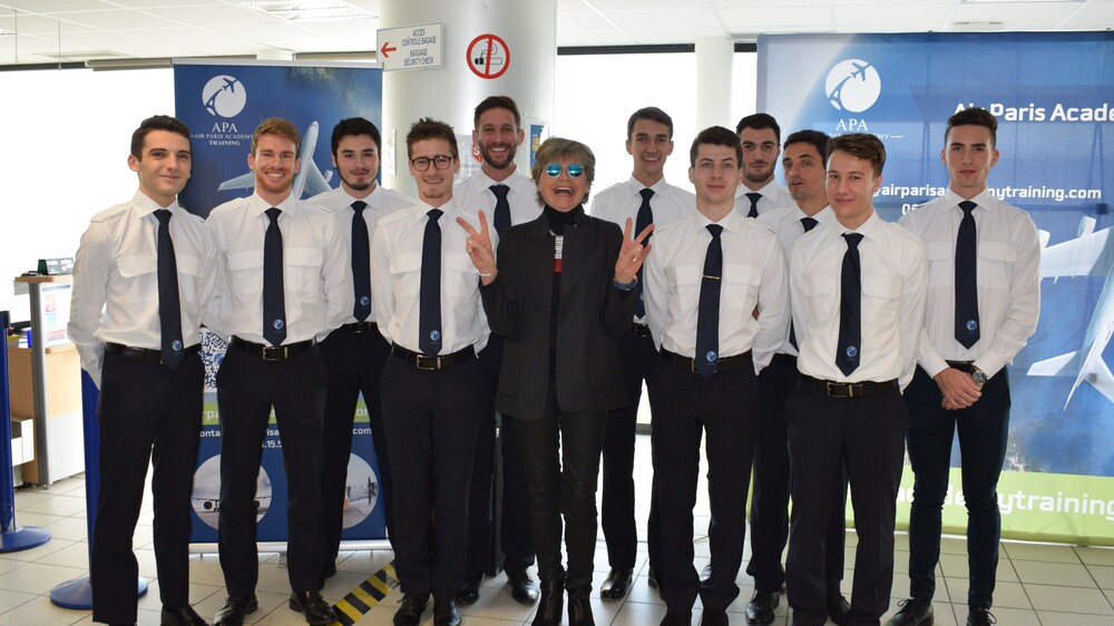 Photo : Les nouvelles recrues de la promotion Blériot de l’Air Paris Academy Training entourant leur marraine Brigitte Motte (photo: Alexia Mellier)