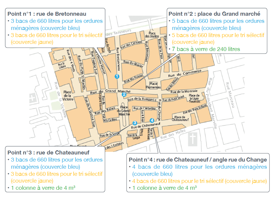 Point de collecte 4 > rue du Châteauneuf / angle rue du Change : 4 bacs pour les ordures ménagères, 4 bacs pour le tri sélectif et 1 colonne à verre.