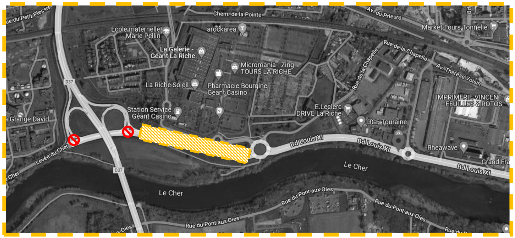 Boulevard Louis XI à La Riche > entre le giratoire du centre commercial Géant Casino « La Riche Soleil » et l’échangeur « Porte de la Riche » du boulevard périphérique.