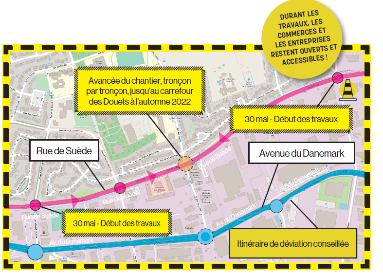 Durée des travaux : depuis le lundi 30 mai, deux chantiers sont menés simultanément à chaque extrémité de la rue de Suède, par tronçons – pour, in fine, se rejoindre au niveau du carrefour des Douets. Les travaux prendront fin en décembre 2022.