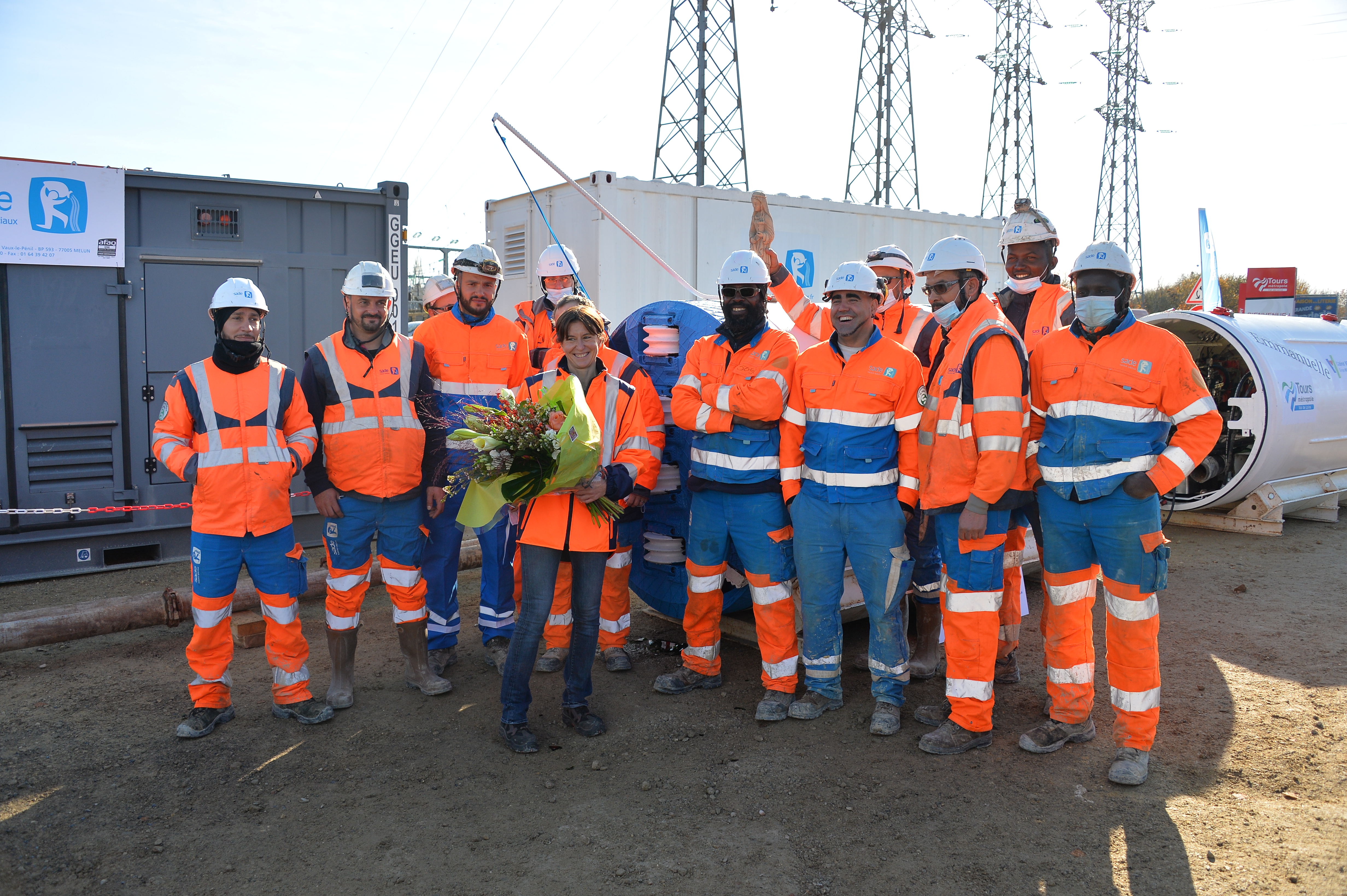 En présence de Bertrand RITOURET, Vice-Président Tours Métropole Val de Loire délégué au Cycle de l’Eau, Francine Lemarié, adjointe au Maire de Saint-Cyr-sur-Loire, Bertrand Renaud, adjoint au Maire de Tours, M. Levebvre de l’Agence de l’Eau Loire-Bretagne, Jérôme Kujawa et Rémi Subra de la SADE et de la marraine du micro-tunnelier, Emmanuelle Volte, Responsable services études, travaux et prospectives à la Direction du Cycle de l’Eau de Tours Métropole.