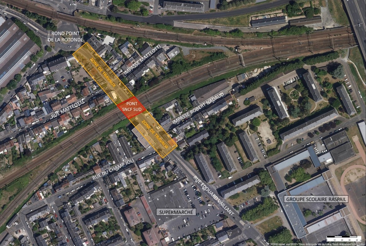 Située rue Edouard Vaillant, entre les impasses Mattéoti et Nadaud, la chaussée sous le pont SNCF Sud sera abaissée pour permettre le passage des nouveaux bus au gaz dont le gabarit est plus haut que les véhicules actuels.