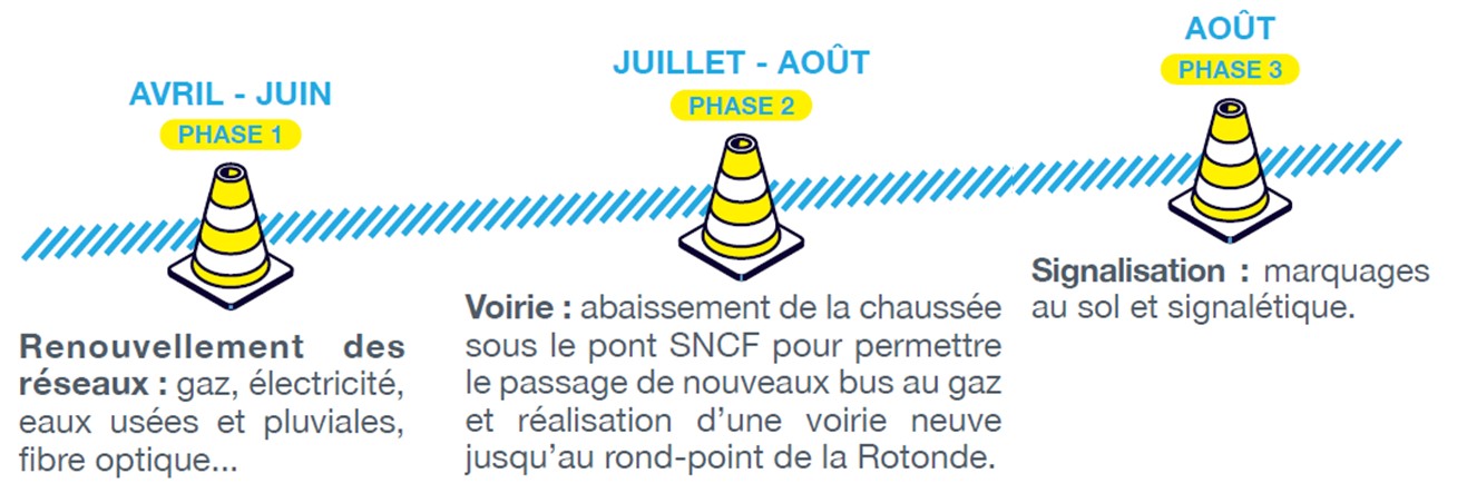 Les travaux, dont la maitrise d’ouvrage est assurée par le Syndicat des Mobilités de Touraine, se dérouleront entre avril et août 2021, en 3 phases :