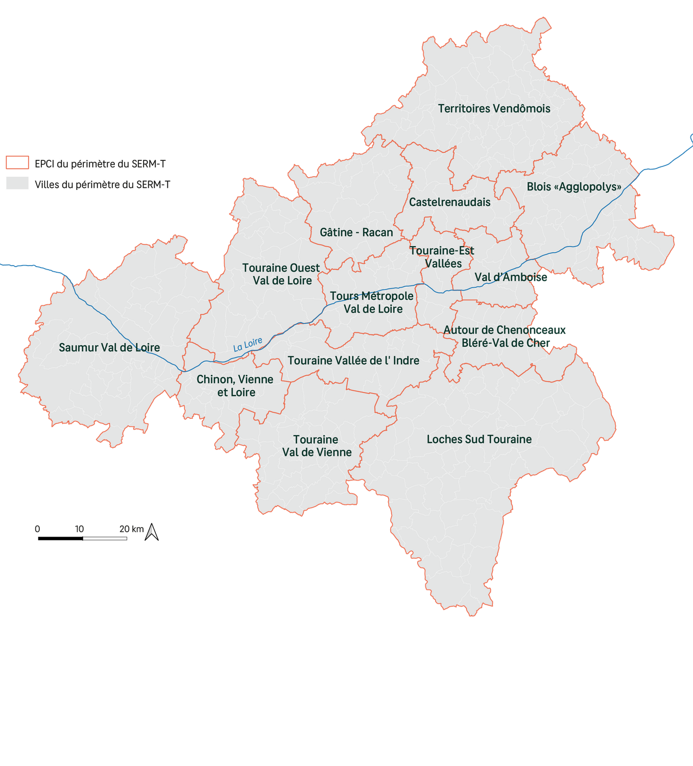 L'ensemble du territoire de l'Indre-et-Loire, ainsi que les intercommunalités de Saumur, Vendôme et Blois afin de tenir compte des dynamiques de flux sur l'axe ligérien élargi, sont donc inclus dans le périmètre du SERM de Touraine.