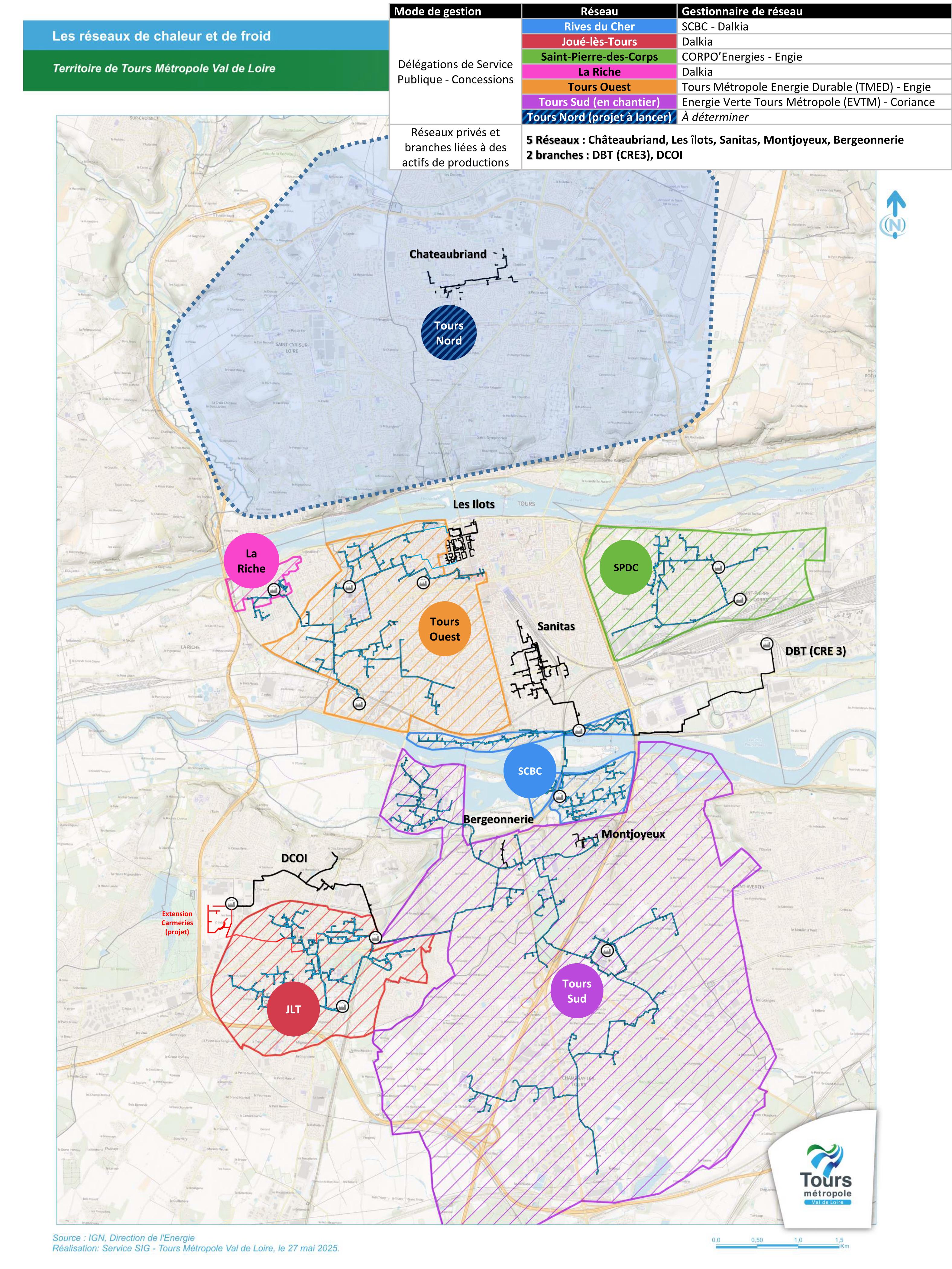 Un 6ème réseau de chaleur (Tours Sud) est effectivement en cours de déploiement dans le cadre d’un contrat de délégation de service public confié au groupe Coriance. Au total, 25 km de réseaux chaud et 5 km de réseaux froid seront créés d’ici 2029 pour desservir les villes de Chambray-lès-Tours, Joué-lès-Tours, Saint-Avertin, ainsi que le campus Grandmont et le quartier des Deux-Lions.