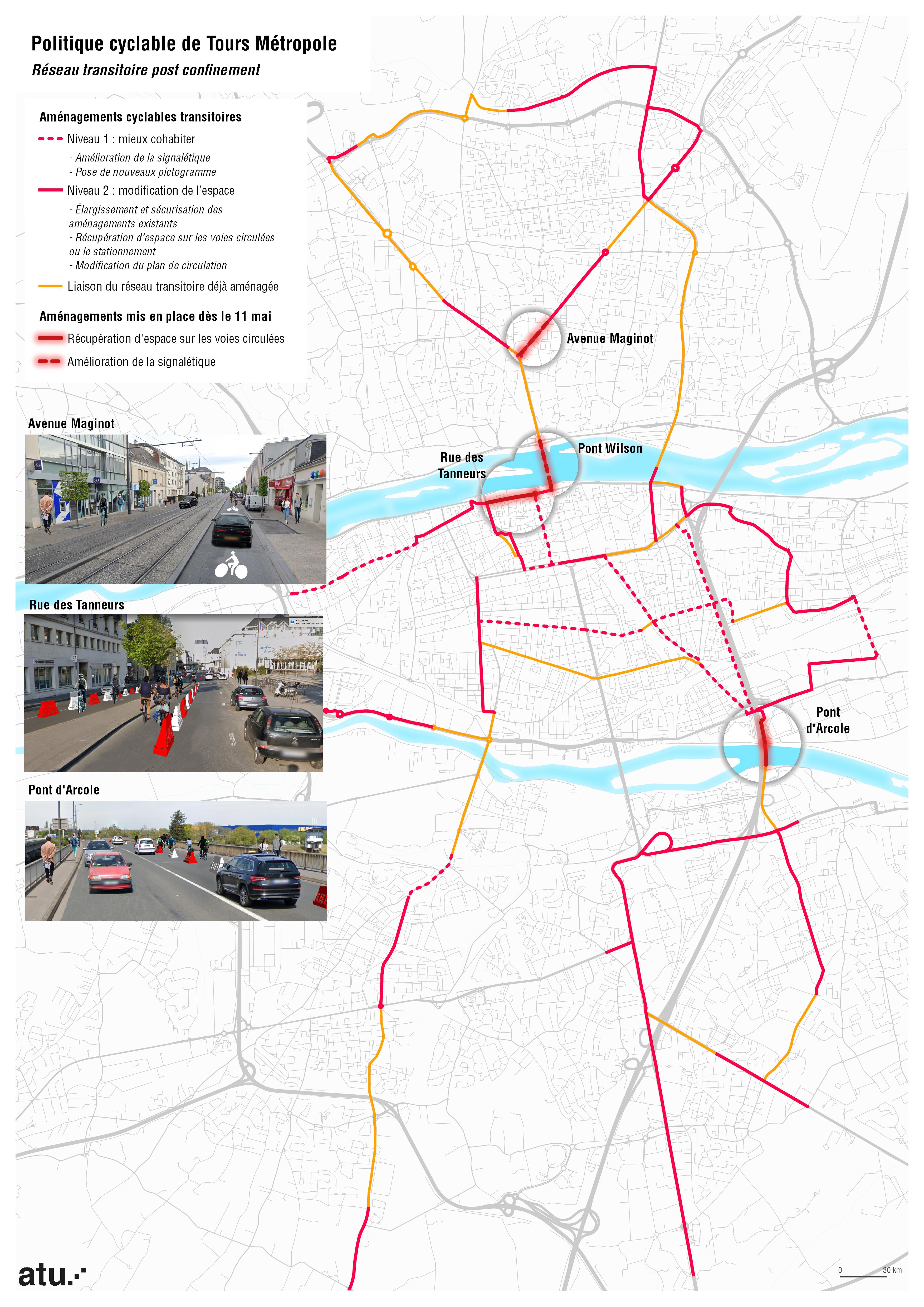 Un réseau cyclable dit « transitoire » est en cours d'élaboration pour offrir aux habitants de Tours Métropole Val de Loire une solution de mobilité qui réponde aux contraintes sanitaires liées au déconfinement. Au total, ce sont plus de 60 kilomètres, répartis sur les 7 communes du cœur de la Métropole (Saint-Cyr-sur-Loire / Tours / Saint-Pierre-des-Corps / Saint-Avertin / La Riche / Chambray-les-Tours / Joué-lès-Tours) qui seront déployés.
