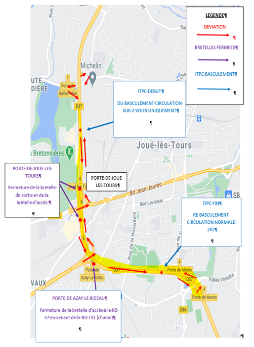 - L’accès aux sorties par les Portes de Joué-lès-Tours ou d’Azay-le-Rideau sera dévié vers la sortie Porte de Monts avec possibilité d’effectuer un demi-tour.