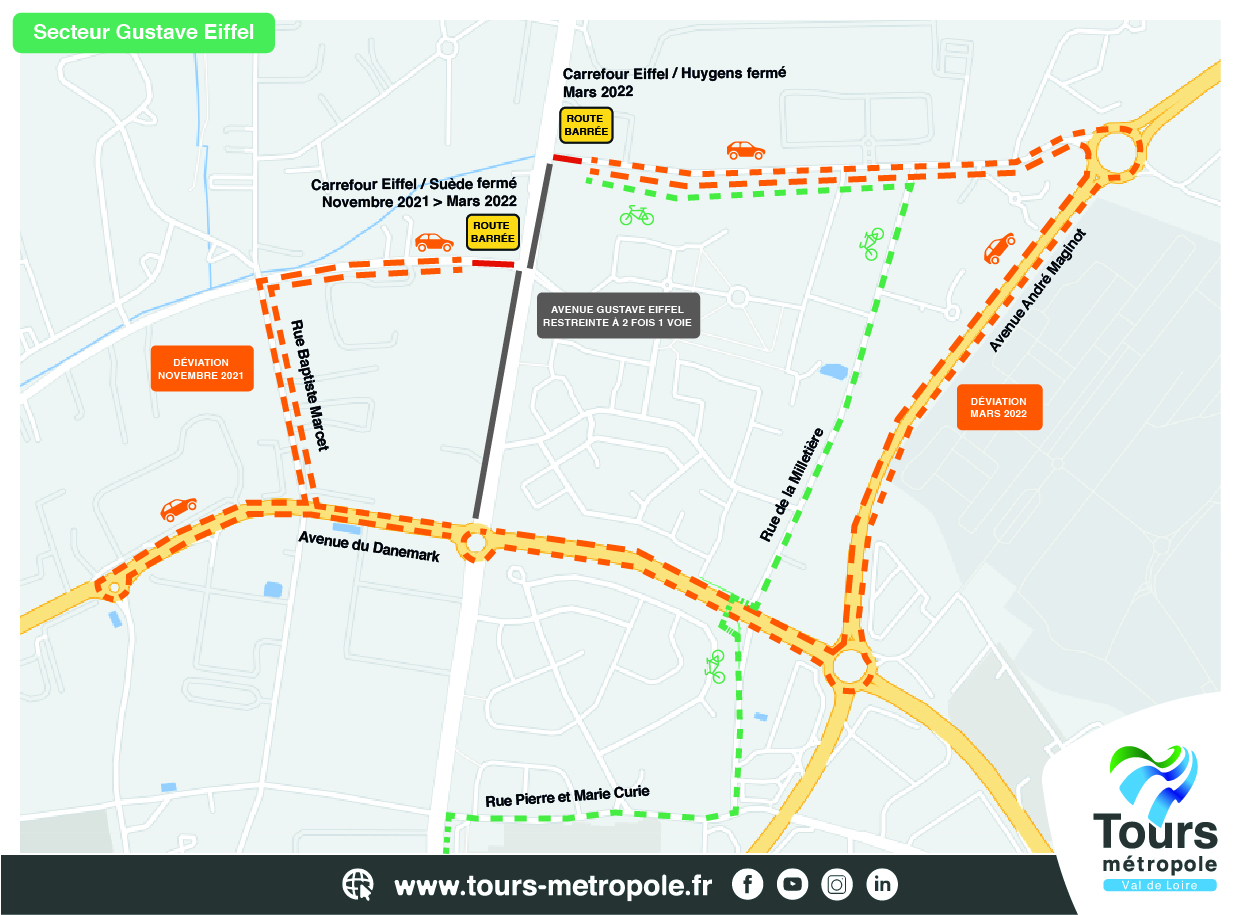 Du 8 novembre 2021 jusqu’en décembre 2022, Tours Métropole Val de Loire mène d’importants travaux sur le secteur nord de la Métropole, entre Tours et Saint-Cyr-sur-Loire (rue de Suède et avenue Gustave Eiffel) pour renforcer le réseau d’assainissement et renouveler le réseau d’eau potable.