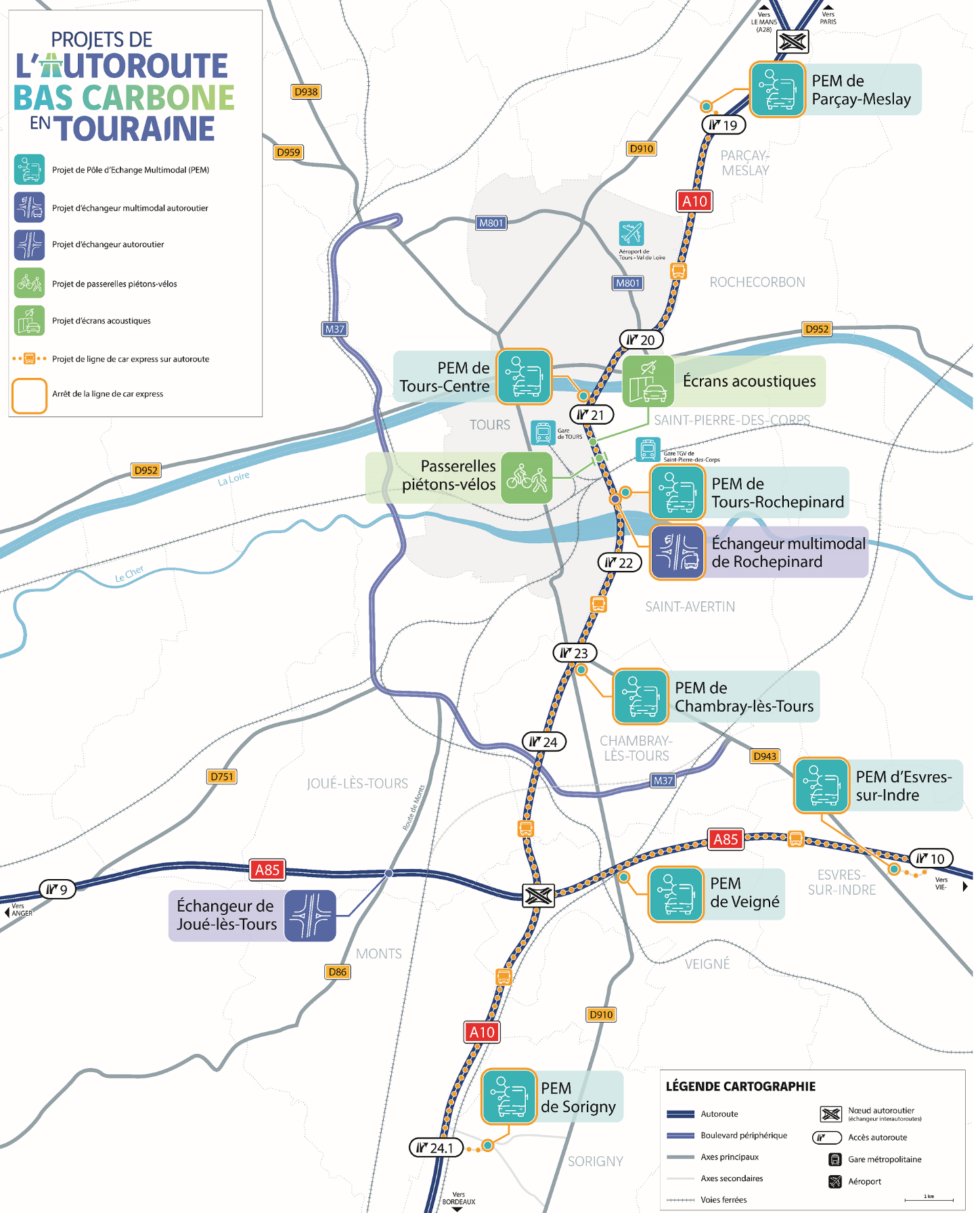 Ces hubs de mobilité, situés à Parçay-Meslay, Tours-centre, Rochepinard, Chambray-lès-Tours, Sorigny, Veigné et Esvres-sur-Indre, permettront aux usagers de se garer dans des parkings relais, éventuellement de recharger leur véhicule électrique ou tout simplement d’accéder au nouveau service de cars express sur autoroute. Ce service innovant connectera efficacement chaque PEM en des points stratégiques de la métropole en lien avec les transports publics existants (bus, tramway, gares…) et les pistes cyclables.
