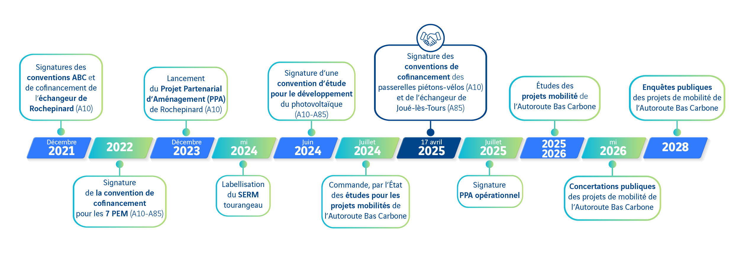 Signée en décembre 2021, la convention Autoroute Bas Carbone (ABC) entre Tours Métropole Val de Loire et VINCI Autoroutes transforme les autoroutes A10 et A85 en un laboratoire pour la mise en œuvre de mobilités décarbonées. L’objectif est de contribuer à la réalisation de la trajectoire fixée par la stratégie nationale bas carbone qui consiste à réduire de 50 % les émissions de gaz à effet de serre d'ici 2030 et d'atteindre la neutralité carbone en 2050. Le projet se concentre sur trois axes : promouvoir les mobilités partagées et douces, mieux insérer l’autoroute dans son environnement urbain, et développer l’électromobilité et les énergies renouvelables, afin de contribuer à la transition énergétique et réduire les émissions de CO2.