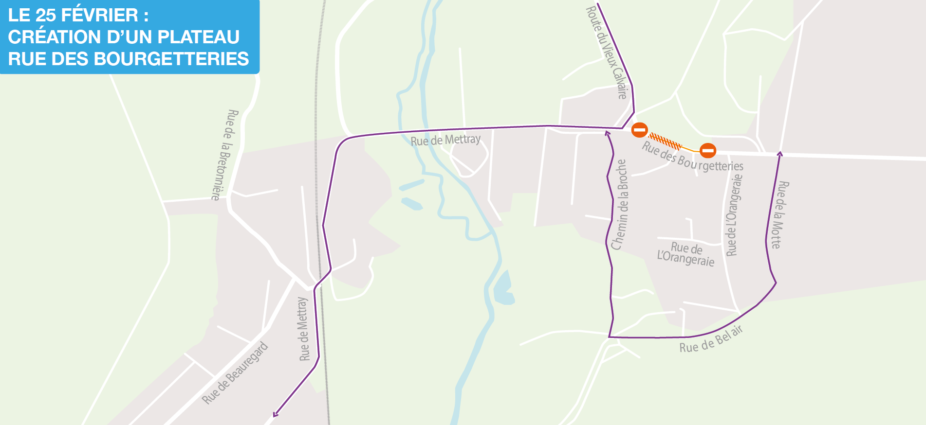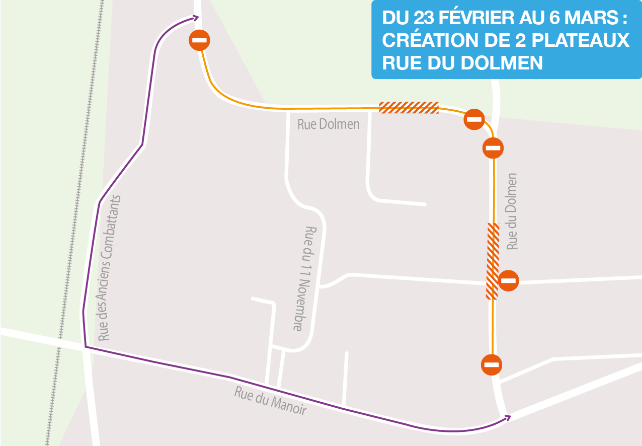Du 16 au 25 février : la circulation routière sera maintenue pendant les travaux. Un alternat routier sera mis en place. Le 25 février de 9h à 16h, la rue sera fermée à la circulation. Une déviation est mise en place.